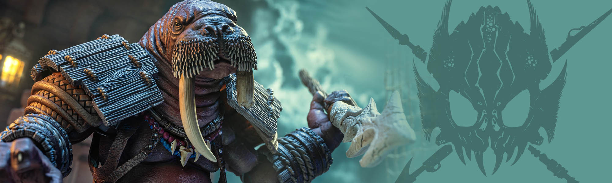 The Rosmurrian harpooner named Odobenn is the muscle of the Undertow’s crew, keeping any unruly crew members in line and also acting as the first attacker whenever the ship comes upon a vessel which Captain Ironskul wishes to board. As the Undertow slinks out from its hiding spot in the Dead Lands to intercept the Ocean’s Lure, Odobenn hurls his harpoons at the unsuspecting vessel. Now attached to the Fishers Guild ship, the Undertow pulls in close as the Rosmurrian brute leads the raiding party that pours onto the deck of the Lure. Expecting to encounter a terrified crew eager to surrender, the Seafarers are surprised when they are instead greeted by a Mercurian Soldier and a Templar Knight leading the Fishers forward to battle.